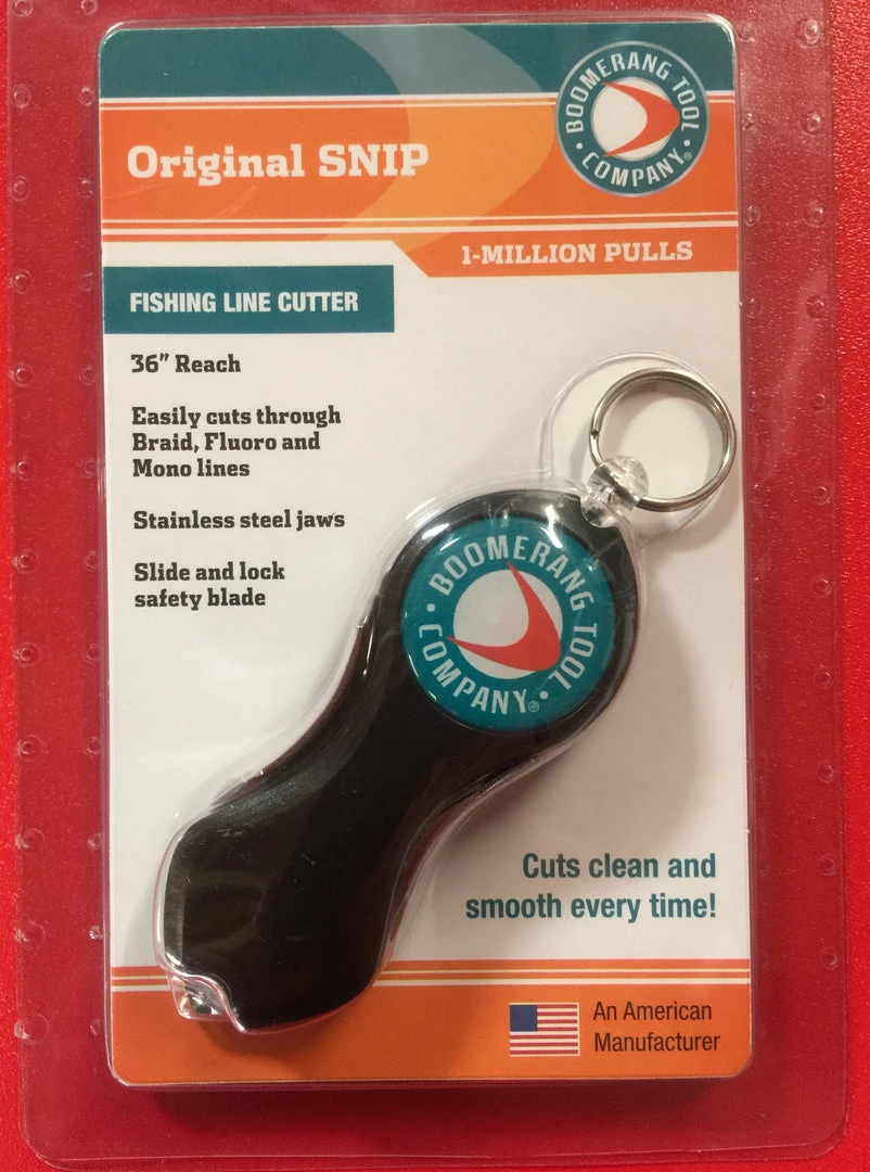The Boomerang Snips are compact, lightweight, extremely durable, and they can make clean cuts with just one hand (even with gloves on) through monofilament, fluorocarbon, and braided line (50-lb test) quickly and easily.Â