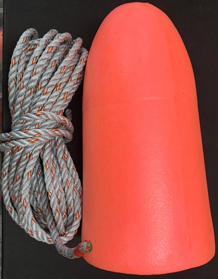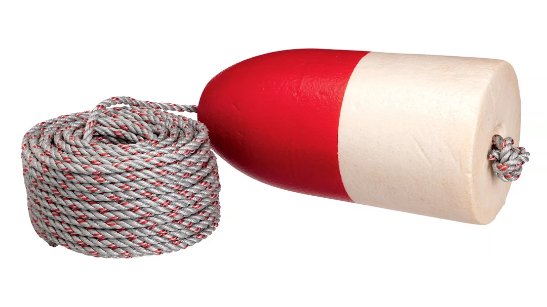 This rigging kit includes a 5X11 commercial lobstering buoy and a coil of 5/16 leaded line.