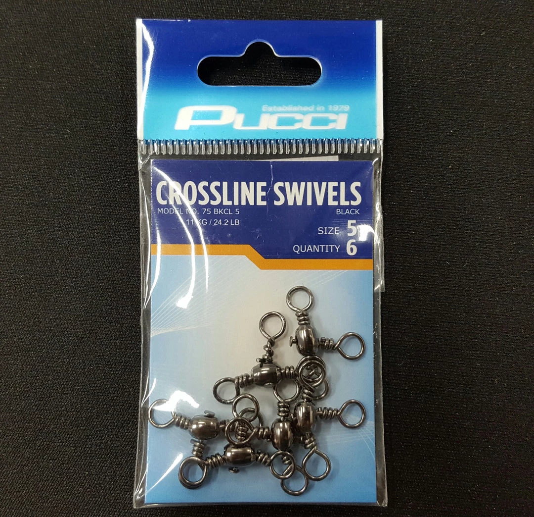 Perfect for dropper setups without the tangles, Pucci Crossline Swivels are offered in two sizes.