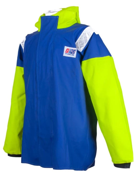 This lightweight safety rain gear jacket, made from nylon backed PU/PVC is Stormline’s top-of-the line lightweight foul weather jacket. The Captain’s foul weather construction rain gear jacket is equipped with a range of features making it a versatile jacket ideal for wet weather work-wear or as recreational fishing clothing.