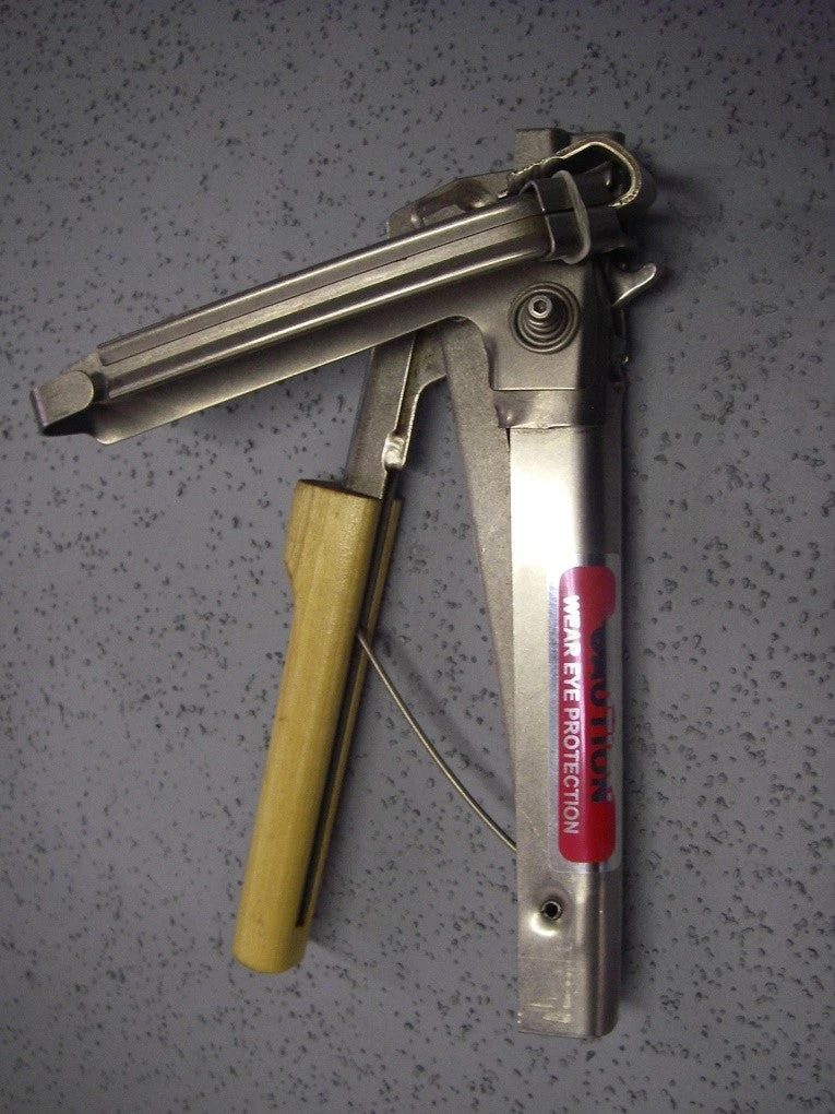 Hand tool for applying Wematic hog ring strips. All Stainless components with a wood handle grip.Â